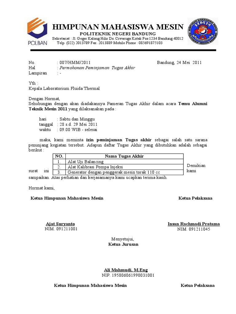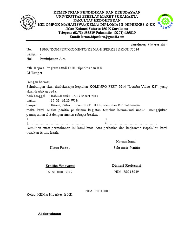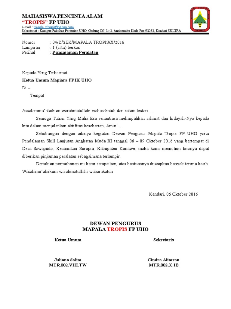 Contoh Surat Peminjaman Sarana Perlengkapan Seminan Himpunan Mahasiswa